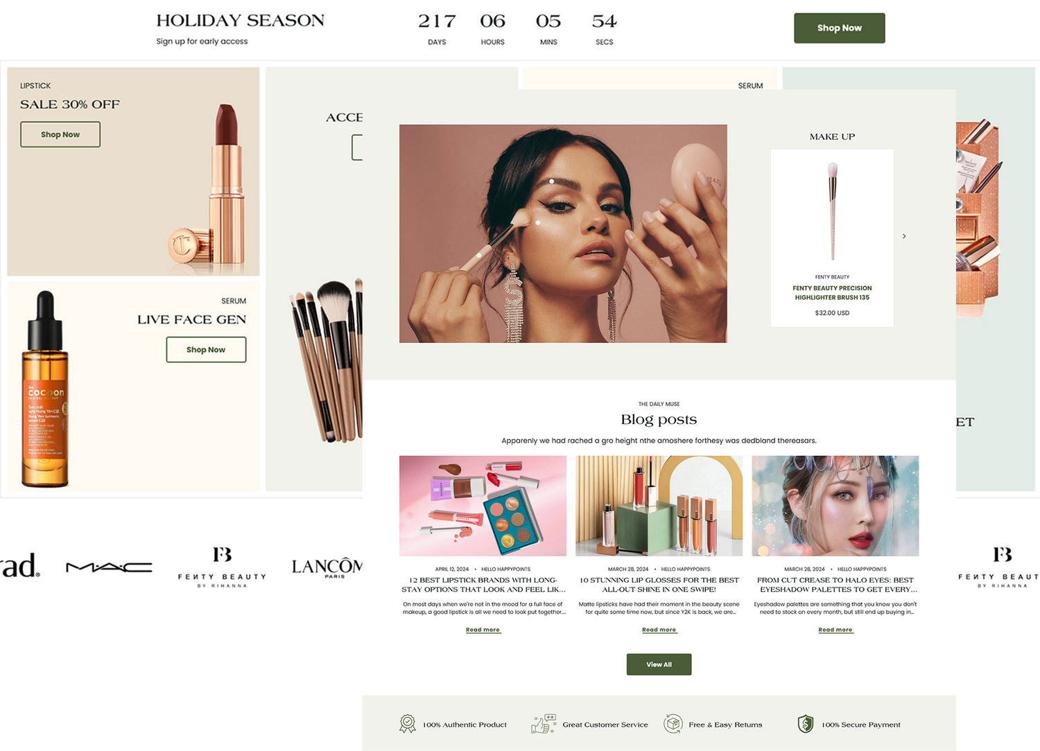 Tailored for cosmetics and skincare with elegant product galleries, ingredient highlights, and beauty tutorials. Features soft color palettes and detailed product information sections.