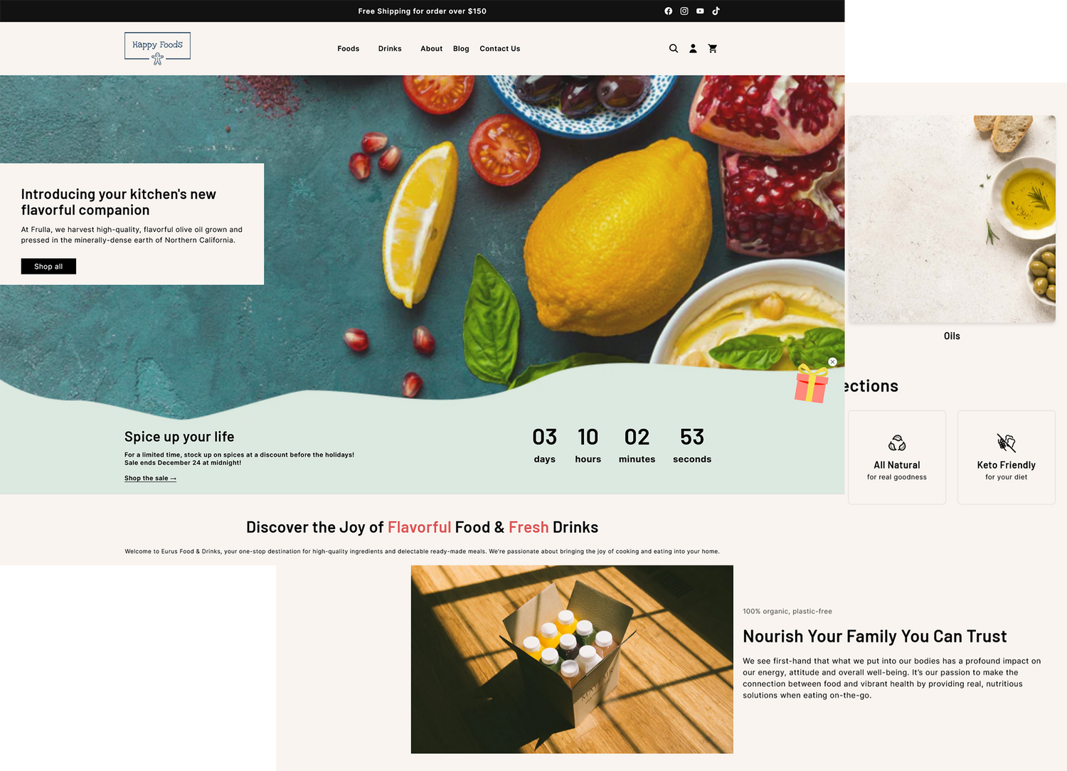 Optimized for food and beverage stores with appetizing product displays, nutritional information, and recipe collections. Features ingredients lists and dietary category filters.