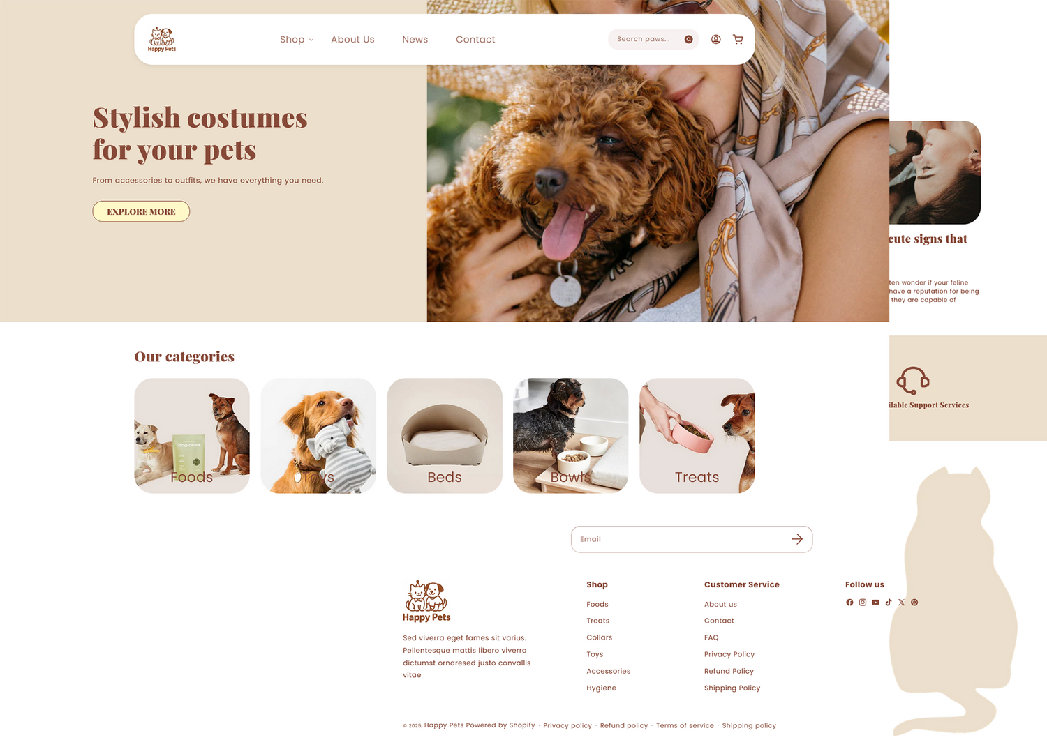 Created for pet products and accessories with playful designs, pet care guides, and product categories by animal type. Includes features for pet profiles and care instructions.