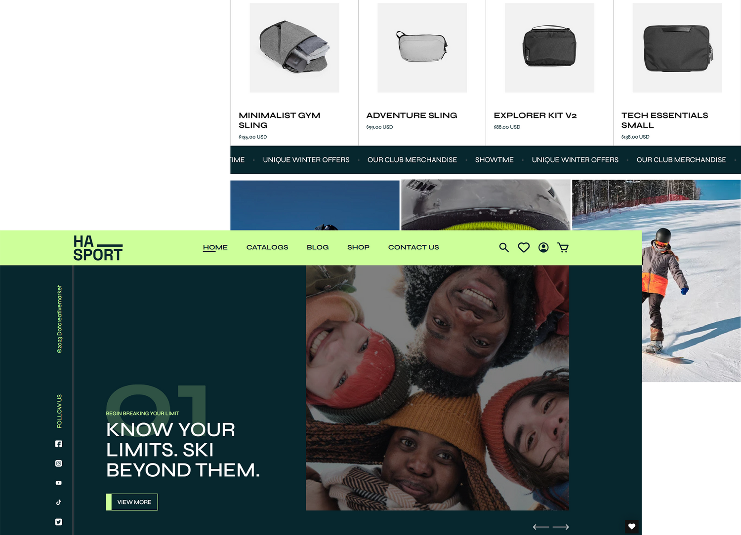 Designed for athletic wear and sporting goods with dynamic layouts, product comparisons, and team collections. Includes features for size charts and performance specifications.